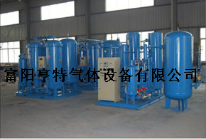 第二步为碳载纯化装置。从氮气缓冲罐出来的普氮,在预热器中和脱氧器中出来的高温氮气进行热交换升温后,经加热器加热到一定温度以后,进入填充了碳催化剂的脱氧器,碳和氮气中的余氧反应生成二氧化碳,再进入静态混合器式冷却器降到常温,再通过变压吸附原理,用填充了分子筛的微热再生干燥器除去二氧化碳和水分,最后经过超精度过滤器过滤以后,得到高纯度氮气。此外在纯化装置中设置的预热器(热交换器),可回收脱氧器中脱氧后氮气的热量,可大大节约能耗30%以上。同时冷却器采用了静态混合器式结构,避免了常规冷却器列管变形而导致的故障问题,大大提高了装置的连续性操作和性能。最后得到的氮气纯度≥99.999%,产量为20m3/h,氮气输出压力为0.5MPa(可调),氮气常压露点≤-60℃。