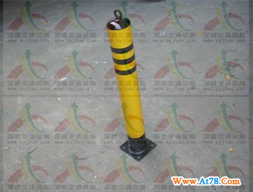 由钢管与法兰盘组成,钢管外贴黄黑反光膜,起到反光警示作用。配有锁芯的立柱,使得在需要的时候可打开锁具,将立柱提起并移动在任何合适的地点,供车辆通行。在交通完毕之后即可将立柱重新置于底座上,上锁后即可避免其他车辆对于自有车位的侵占。可以在车库前、或者其他认为重要的场合前设置,起到保护好车库大门、避免暴力破坏的作用。