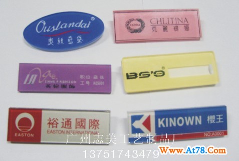 A: 员工胸牌、徽章、奖章、小标牌、金属小贴牌、滴胶贴牌等。(工艺有:有机丝印、金属压铸、双色板雕刻、橡胶热压、不干胶滴胶、马口铁冲压、金属蚀刻等)