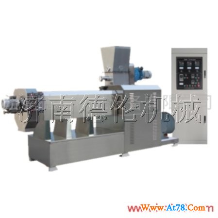 该机由供料系统、挤压系统、旋切系统、加热系统、传动系统、控制系统组成。采用先进的螺杆挤压膨化技术,利用高温高压将物料熟化并膨化成型,一次性完成。主机采用变频调速,保证生产过程的稳定性。产品花色、品种多样、外表美观、自然逼真、质感细腻、原料使用广泛