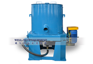 离心选矿机是目前最新的一种重力选矿设备,该设备的原理是利用离心力来扩大矿物颗粒的重力来使重颗粒和轻颗粒分离。其关键的部件是一个锥形的 富集锥,它由电机带动高速旋转并由加压的反冲水包围。进入离心机分选的物质通常是球磨机研磨过的矿物或者水力旋流器的溢流矿浆,矿浆从富集锥的上端被注入 到富集锥的底部,富集锥的内部有一排排肋状物形成的凹槽,富集锥旋转产生的离心力会将矿物甩向凹槽,但由于凹槽中的向外喷射的反冲水的作用,只有重矿物颗 粒能克服反冲水的阻力一直停留在凹槽内形成精矿,轻矿物因受到的离心力较小,难以克服反冲水的作用,则被反冲水冲出凹槽并在不断注入的水流的带动下从富集 锥上端溢流出来从而成为尾矿。