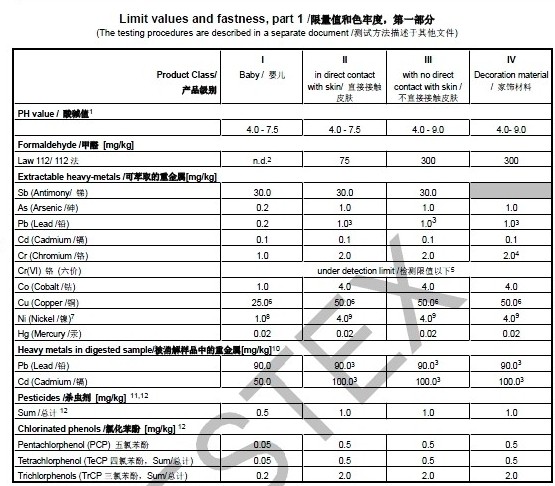 Oeko-Tex Standard100禁止和限制纺织品上可能存在的已知害物质,其技术要求是:pH值、甲醛、可萃取重金属、镍、杀虫剂、除草剂,含氯苯酚,可分解芳香胺染料、致敏染料、有机氯化导染剂,有机锡化物(TBT / DBT ),PVC增塑剂、色牢度、有机挥发气体、气味。