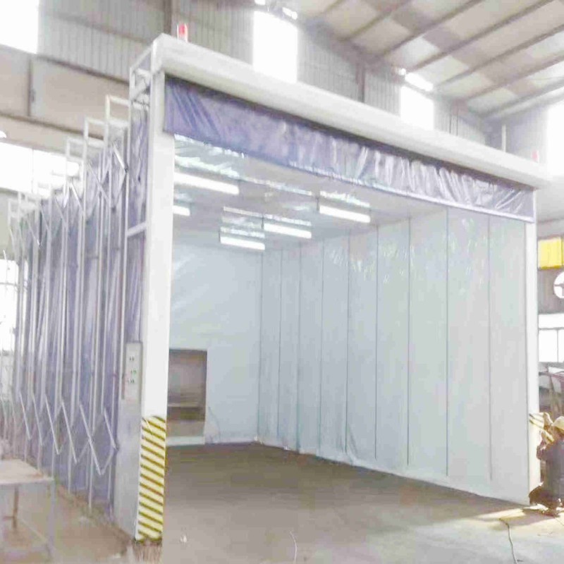 整个伸缩房由以下几部分构成:门框架、帆布支撑网、剪式伸缩机构、阻燃pvc帆布、驱动机构等部分组成。门框架采用工业型材制成,是驱动电机直接带动的部分,整个伸缩机构稳定运动的关键所在。大门框架上设置有开关按钮并行程开关,用以自动控制大门的伸缩。除去门框,其余部位就是帆布支撑网,是阻燃帆布安装连接的骨架,由多组型材骨架构成,并通过剪式伸缩机构将整个相对独立的骨架连接在一起,形成一个稳定的整体。在每两个帆布支撑网之间,采用剪式伸缩机构相连,其结构尺寸决定了伸缩量,同时为了***上下都能同时实现伸缩动作,在每侧上下各布置一套剪式伸缩机构,两者之间通过连杆形成一个同步运动机构。在整个网架之间采用工业阻燃pvc帆布,这是形成相对封闭作业间的“墙板”,也是***空气有序流动的“房体”。安装时每两个支撑网采用一块工业帆布。在喷漆室的大门上安驱动部分。驱动部分采用减速电机,传动到多节长轴上,再由长轴两端链轮同步传动到两侧主动轮上。整个驱动前进、后退采用保护:双向两级行程保护轨道终端设置限位车挡;门柱上边有控制盒,操作方便。