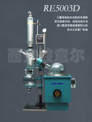 RE5003D型旋转蒸发器采用进口高档变频器控制,无级调速使玻璃旋转瓶恒速旋转,物料在瓶壁形成大面积均匀薄膜,再由可控恒温水浴锅对旋转瓶均匀加热,在系统抽真空条件下高速蒸发,溶媒蒸气经高效玻璃双冷凝器冷却,回收于收集瓶。RE5003D型旋转蒸发器另设有加料接口及放料机构,便于蒸发过程中自动、连续工作。由于RE5003D型旋转蒸发器是在真空条件下工作,且与物料接触部分全部采用耐高温高硼硅玻璃和聚四氟己稀材料,所以RE5003D型旋转蒸发器特别适用于对热敏感性物料及对不锈钢等金属材料有污蚀的物料的浓缩、结晶、分离、溶媒回收。 RE5003型旋转蒸发器接触面积大、蒸发效率高、使用方便、噪声低、密封可靠,可处理易发泡物料,且规格齐全,已形成2L、5L、10L、20L、50L等多种规格产品,便于不同需要的用户选择。