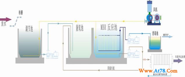 泉特环境中水设备工艺示意:原水→格栅→调节池→提升泵→生物反应器→循环泵→膜组件→消毒装置→中水贮池→中水用水系统