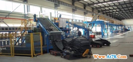 胎面/胎侧复合挤出生产线——由两台或三台销钉式冷喂料挤出机组成。配置了液压自动复合胎面挤出机头,实现了几种不同的胶料在机头内一次复合挤出成型,由于设计时螺杆、机头采用了特殊机构和独特的技术参数,所以挤制的胎面致密度高,塑化混炼效果好,断面尺寸精确、稳定,表面光滑。选用不同的机头和螺杆参数可适用于各种规格的工程胎、子午胎、斜交胎的胎面、胎侧复合挤出。