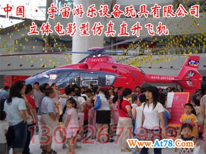 立体电影型野狼一号仿真直升飞机:规格:长8米。宽5米。高3米。 功率:5KW 电压:220V 承载:9人 载重:1吨 功能:内设立体电影设备,内外立体音效,冷暖空调,飞机整体前后左右摆动,运行时螺旋桨转动,乘坐后可与仿真飞机快照合影留念,照片立即可取。 优点:新颖,和其他老产品不重复,占地小,不用拆装,(插电立即可用)。遥控管理,方便科学。(几十米外可以操作,启动,停止) 内存几十部立体电影,一人如想看完要连续消费几十次,冷暖空调四季如春,外部音效可传到200米外,直升飞机造型完全仿真,照相清晰度极高,快捷,价格远远低于进口立体电影仓(仅是它的十几分之一)生产厂家:中国。宇宙游乐设备玩具有限公司。电话:0373-2311336 2678881 2678882 2678883 传真:0373-2677699 联系人:13072671989王经理 13233818366司经理 中文网www.xxyzwj.com中英文网www.yzylsb.com诚信网www.yz568.cn 地址:河南省新乡市宏力大道西段西冀场工业区南1号