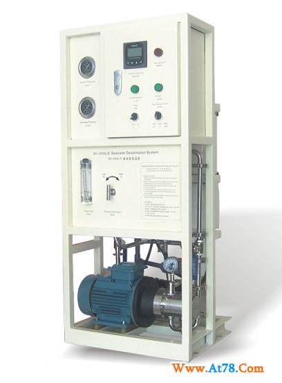 船用,陆用海水淡化机适用于海岛、海岛驻军、海滨浴场、远洋船舶、舰艇、海水钻井平台、海岛旅行区及沿海缺水城市。能够有效去除海水中的无机盐,重金属离子,有机物细菌等有害成分,将海水淡化符合国家生活饮用水标准的优质水,系统预处理采用全自动多路组合阀,实现全自动大流量反冲洗以及正洗,该系统的全部壳体管路全部采用耐腐蚀材料,保证了全套系统的经久耐用。主机RO系统是采用了最先进的RO系统软件仿真设计和优质的膜组件,根据设备的产水量结合高效独特的能量回收技术而成,保证了系统运行的低能耗。