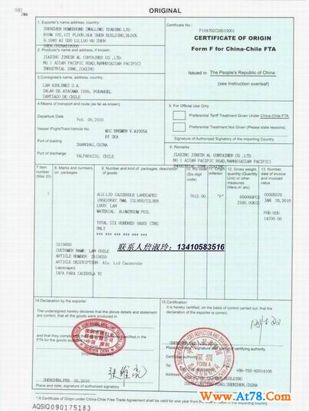 人们称呼为:Form F、智利产地证、原产地证Form F、智利原产地证Form F等等。。。。 智利原产地证明书Form F:我国与拉美国家签署的第一个自由贸易协定—《中国—智利自由贸易协定》正式实施。智利对原产于我国的5891种产品,及中国对原产于智利的2806种产品的关税立即同时降为零。 本公司可办理此证书价格优惠!您的满意我们的追求;预祝我们的合作成功!
