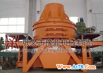 物料由机器上部垂直落入高速旋转的叶轮内,在高速离心力的作用下,与另一部分以伞状形式分流在叶轮四周的物料产生高速撞出粉碎,物料在互相撞击后,又会在叶轮和机壳之间料层形成涡流多次撞击、磨擦而粉碎,从下部排料斗排出。形成闭路多次循环,由筛分设备控制成品粒度。